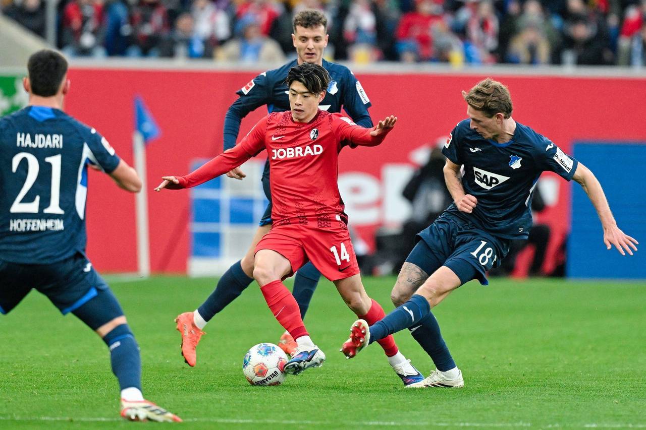 Yuito Suzuki und Freiburg: Von Hoffenheimern umzingelt. © Uwe Anspach/dpa