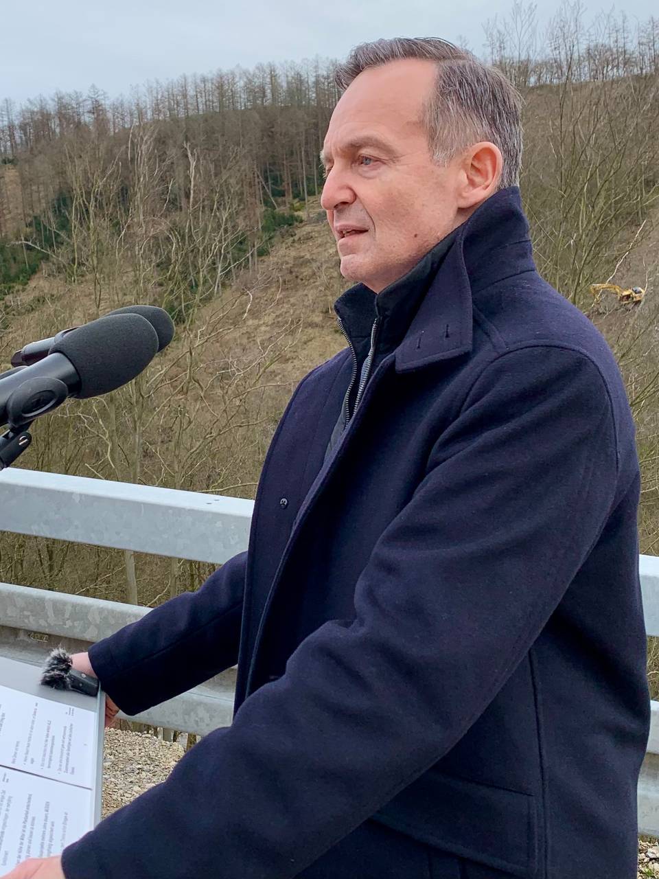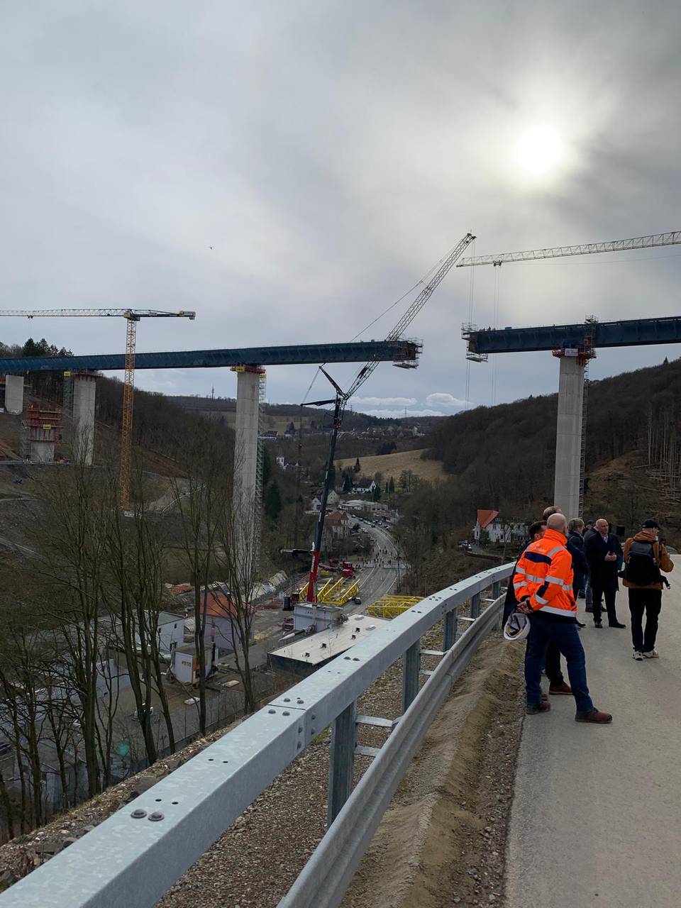 Wissing war ins Sauerland gekommen, um sich ein Bild vom Baustellenfortschritt zu machen: Seit mehreren Monaten wird der stählerne Überbau von beiden Seiten des Tales Stück für Stück über die Pfeiler geschoben. Nun sind beide Teile nur noch wenige Meter voneinander entfernt und sollen zeitnah miteinander verbunden werden, wie es am Dienstag von der Autobahn GmbH hieß. Der Brückenbauer spricht in so einem Fall von der "Stahlhochzeit".