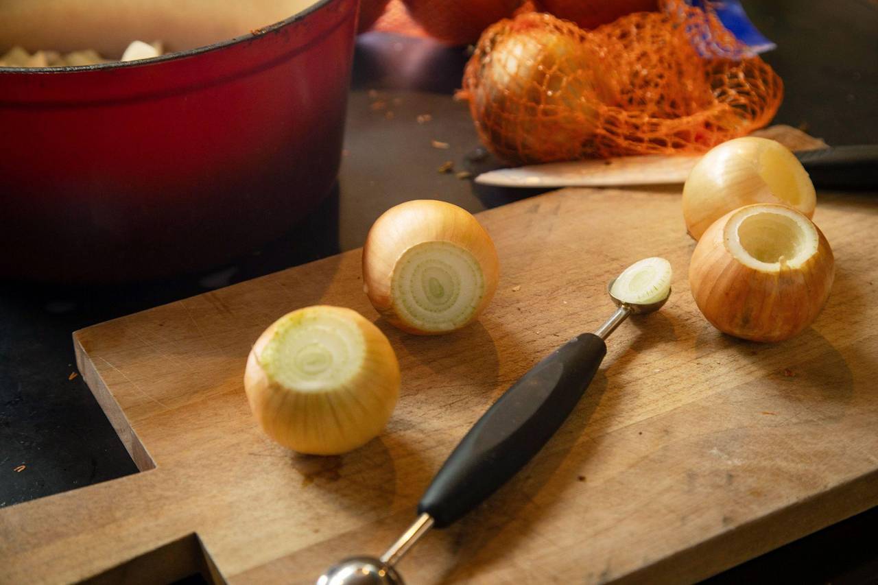 Mit einem Parisienne-Löffel oder einem Kugelausstecher wird die ungeschälte Zwiebel ausgehöhlt.
