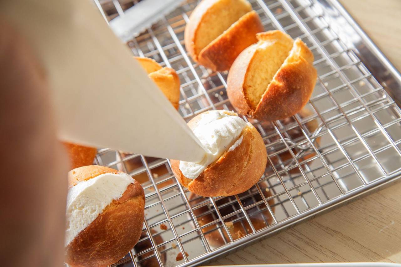 Aus Puderzucker, echter Vanille und Vollrahm wird die Creme hergestellt, die als Füllung in die herausgeschnittenen Slots der Maritozzo Romano gefüllt wird. © Christin Klose/dpa-tmn