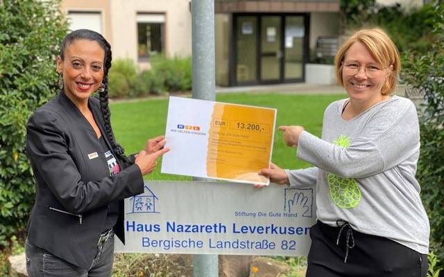 Einige Räumlichkeiten hat die Kinder- und Jugendhilfeeinrichtung bereits saniert, die Geldspritze soll aber vor allem dem Wiederaufbau des Asche- und Sportplatzes zugutekommen. Möglich gemacht hat das eine Leverkusenerin. Sie hatte die Einrichtung als förderungswürdiges Kinderhilfsprojekt bei einer RTL-internen Aktion namens „Von Herzen Gutes tun“ eingereicht – mit Erfolg. Ich wollte das Geld unbedingt in unsere Stadt holen, so die RTL-Mitarbeiterin. Sie hat den entsprechenden Scheck am Donnerstagnachmittag an das Haus Nazareth übergeben, hier sind derzeit über 100 Kinder untergebracht.