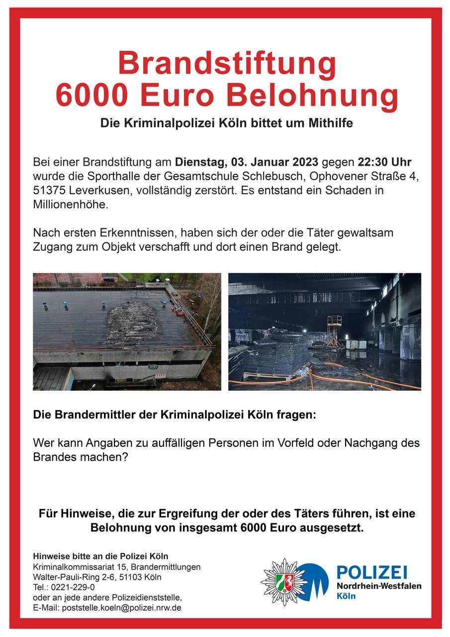 In Leverkusen-Schlebusch hängen aktuell viele Fahndungsplakate. Die Polizei hofft so auf neue Hinweise zu dem Brand in der Sporthalle der Gesamtschule. Für Hinweise, die zur Ergreifung der Täter führen, gibt es eine Belohnung von insgesamt 6.000 Euro.