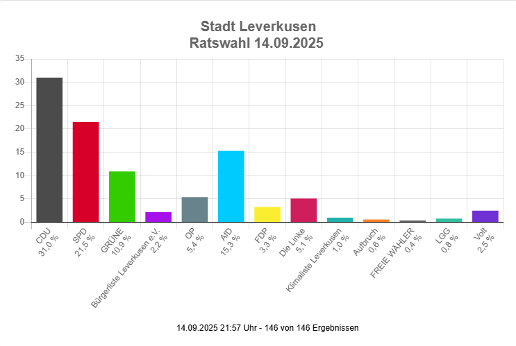 Die CDU konnte bei der Wahl am 14.09. fast alle Direktmandate für sich gewinnen. Lediglich vier Wahlkreise gingen an die SPD: Wiesdorf-Nordwest, Wiesdorf-Süd, Manfort und Rheindorf-Mitte. In den Wahlbezirken unserer Stadt gab es große Unterschiede bei der Wahlbeteiligung. Spitzenreiter waren Bergisch Neukirchen und die Waldsiedlung/Schlebusch-Südost, wo jeweils 69 Prozent der Wahlberechtigten ihre Stimme abgegeben hatten. Ganz anders sah es in Rheindorf-Mitte und Quettingen-West aus: Dort lag die Beteiligung bei nur 43,4 Prozent beziehungsweise 39 Prozent.
