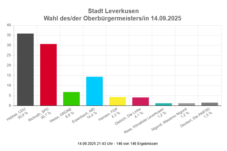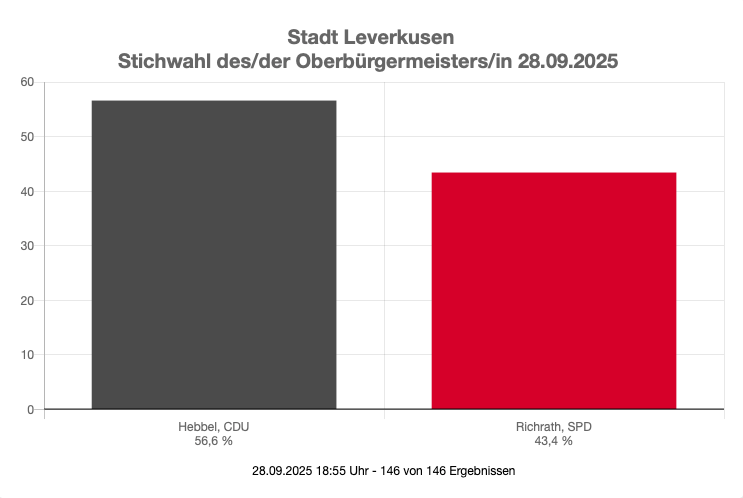 Hebbel (CDU) bekam 56,6 Prozent der Stimmen und liegt damit deutlich vor Amtsinhaber Uwe Richrath (SPD), der 43,4 Prozent der Stimmen bekommen hat. Schon im ersten Wahlgang vor zwei Wochen hatte Hebbel einige Prozentpunkte vor Richrath gelegen. Weil er aber keine absolute Mehrheit bekam, ging es in die Stichwahl. Die Wahlbeteiligung bei der Stichwahl liegt bei 38,1 Prozent.