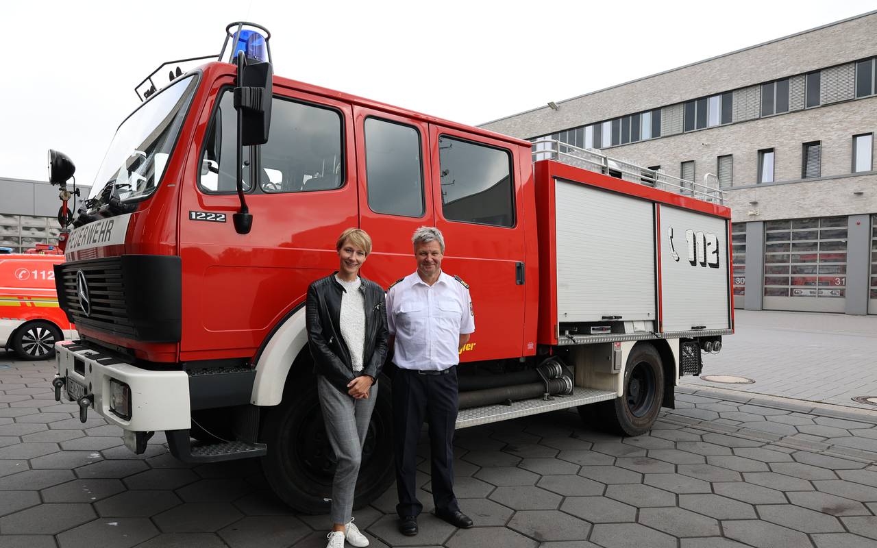 Ein ehemaliges Fahrzeug der Leverkusener Feuerwehr ist nun in der Ukraine im Einsatz. Sie hat ein ein ausgemustertes Löschfahrzeug an die westukrainische Kleinstadt Tysmenyzja gespendet.