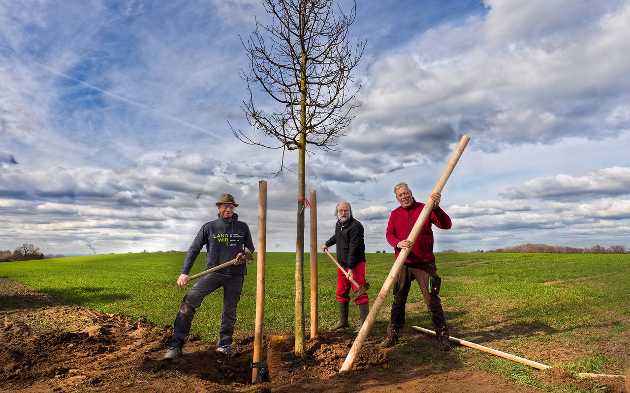 An der schönen Aussicht in Lützenkirchen steht jetzt eine neu gepflanzte Stieleiche. Mehrere Nachbarn haben sich zusammengetan, haben Traktoren und Bagger organisiert und mobilisiert, um den Baum zu pflanzen.