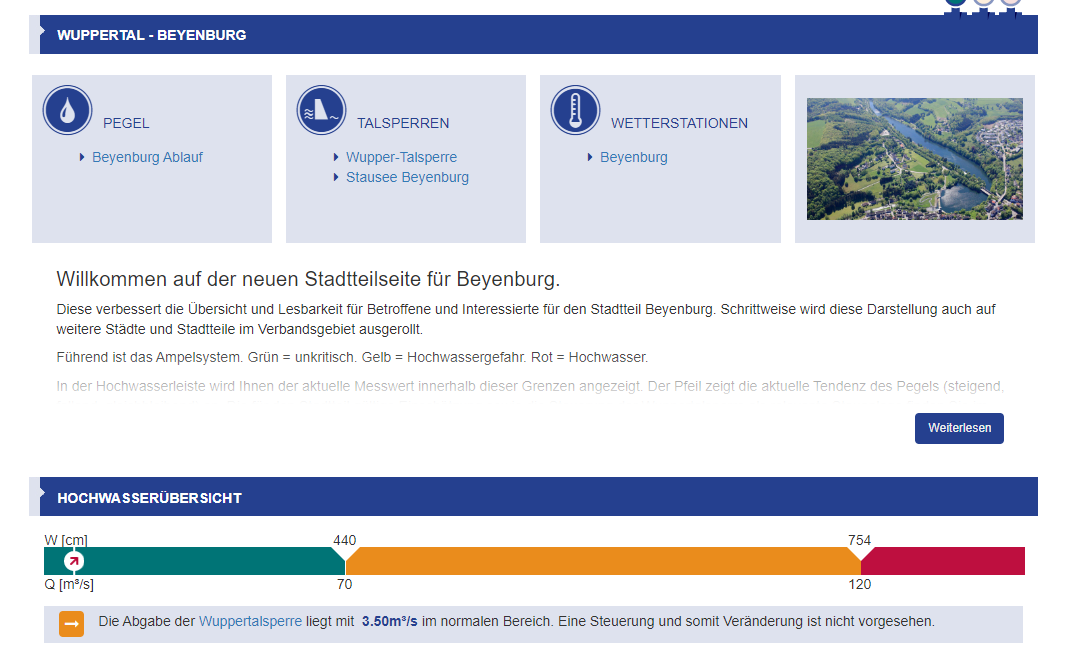 Auf den ersten Blick informiert eine Flut-Ampel, ob eine Bedrohungslage besteht. Außerdem gibt es ausführlichere Infographen. Das neue Design hat der Wupperverband gemeinsam mit Nutzern erarbeitet. Im Laufe des Jahres wird es auf den ganzen Zuständigkeitsbereich erweitert. Wann genau dieses Jahr die Seiten für Leverkusener Uferbereiche geupdatet werden, ist noch offen. Hier kommt ihr zum Portal