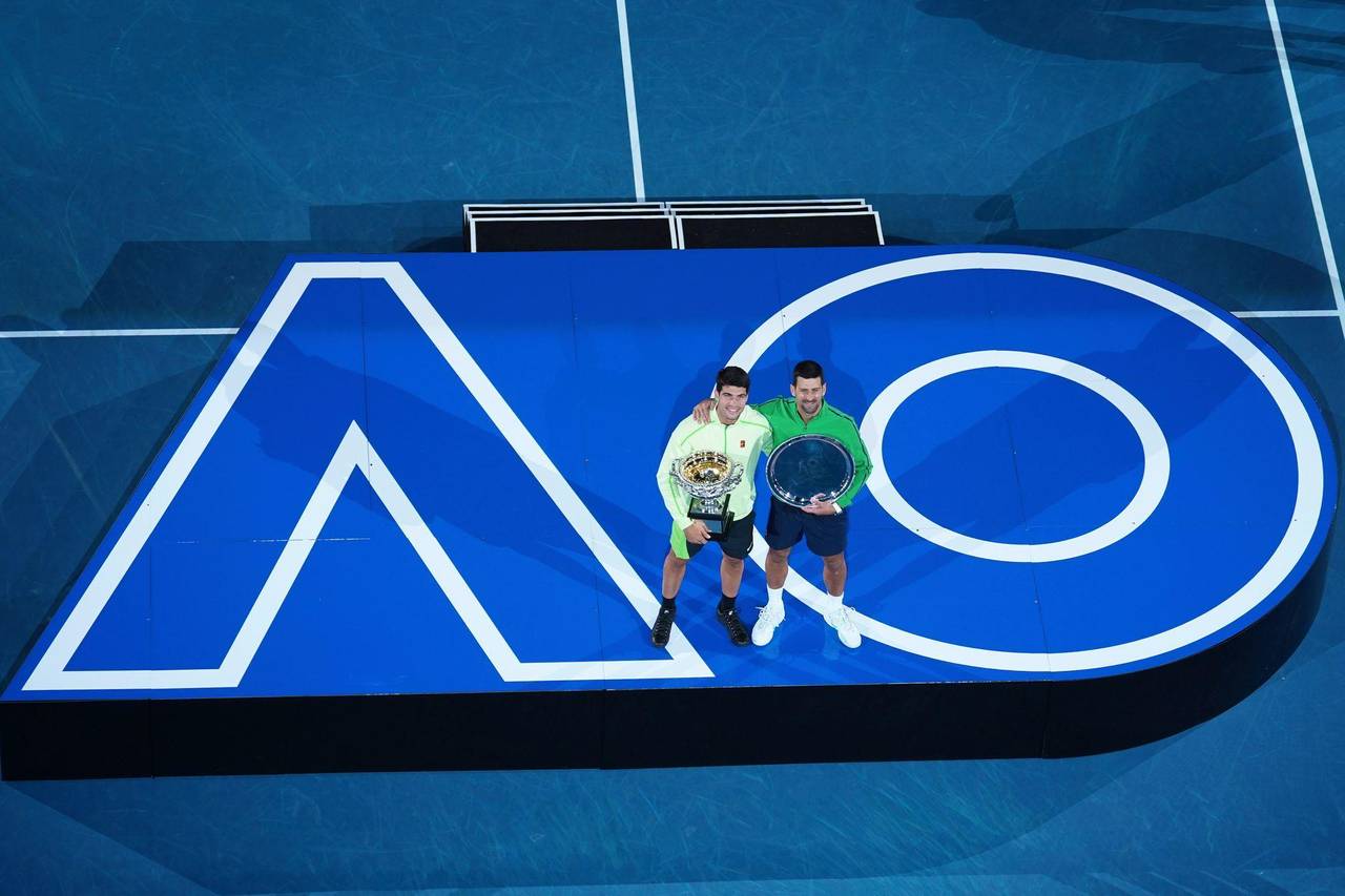 Melbourne (dpa) - Nachdem er Tennis-Geschichte geschrieben hatte, ließ sich Carlos Alcaraz auf den hellblauen Boden in der Rod Laver Arena fallen. Im Duell der Generationen gewann der Weltranglisten-Erste erstmals den Titel bei den Australian Open und damit als jüngster Spieler der Geschichte bei allen vier Grand-Slam-Turnieren die Trophäe. Im Alter von 22 Jahren und 272 Tagen setzte sich der Spanier in Melbourne im Endspiel gegen den 38 Jahre alten Novak Djokovic mit 2:6, 6:2, 6:3, 7:5 durch.