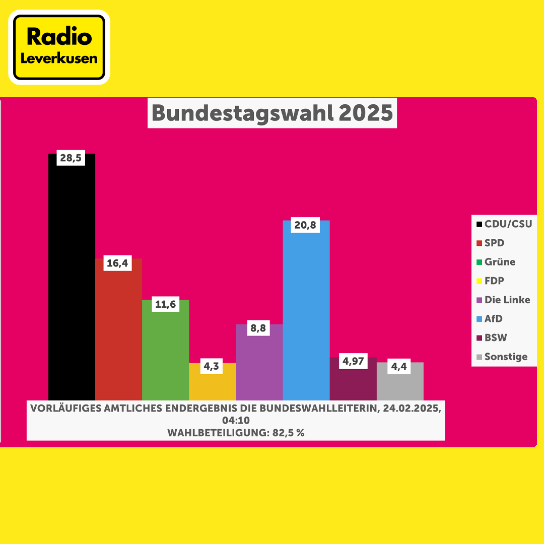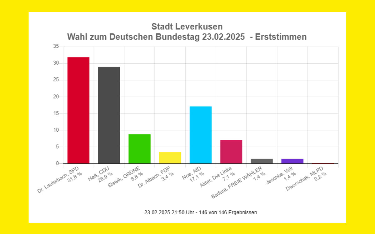 Mit Nyke Slawik und Karl Lauterbach ziehen zwei Bundestagsabgeordnete für Leverkusen in den Bundestag: Das ist eines der zentralen Ergebnisse aus unserer Stadt nach dem Wahlabend. Außerdem wird deutlich: Leverkusen ist Politik nicht egal: 81,2 Prozent der Wahlberechtigten gaben ihre Stimme ab, das ist eine sehr hohe Wahlbeteiligung. Zum Vergleich: Bei der Bundestagswahl 2021 lag die Beteiligung noch bei 73,6 Prozent.