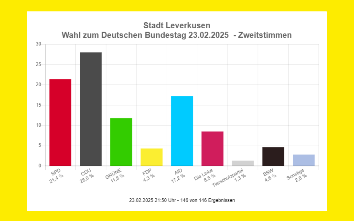 Während die SPD in der Zweitstimme relativ konstant in der ganzen Stadt bei um die 20 Prozent liegt, gibt es bei den anderen Parteien von Stadtteil zu Stadtteil relativ große Unterschied. Stark sieht man das bei der Linken, die in Wiesdorf und Manfort auf über 12 Prozent kommt – in Bergisch Neukirchen dafür nur auf 5,4. Auch die AfD hat dort oben am schlechtesten abgeschnitten, während sie in Quettingen fast 24 Prozent holen konnte. Die FDP dagegen wäre in Bergisch Neukirchen locker in den Bundestag gekommen, während sie in Manfort gerade mal auf 2,6 Prozent kam. Alle Stadtteil-bezogenen Ergebnisse zur Wahl findet ihr hier.