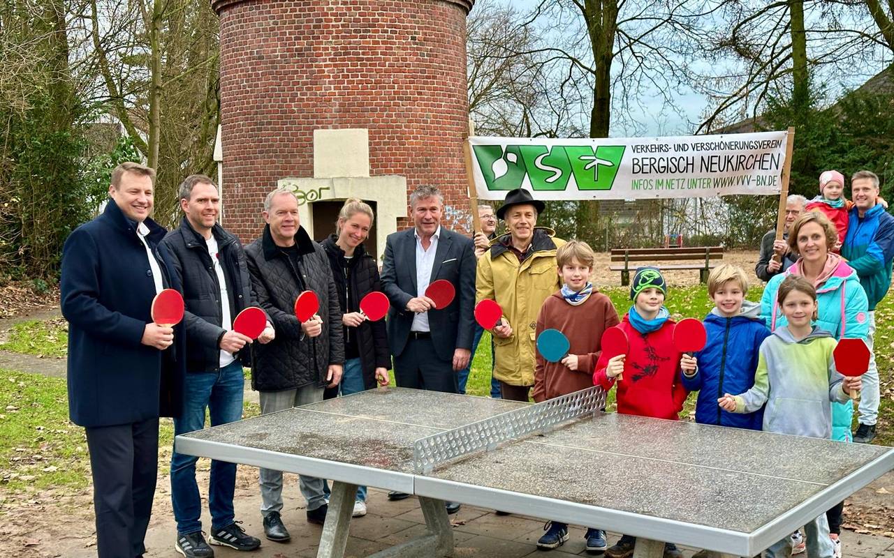Am Spielplatz am Wasserturm gibt es jetzt eine neue, öffentliche Tischtennisplatte. Möglich gemacht wurde das Projekt durch die Idee eines Grundschülers und den Einsatz des Verkehrs- und Verschönerungsvereins Bergisch Neukirchen.